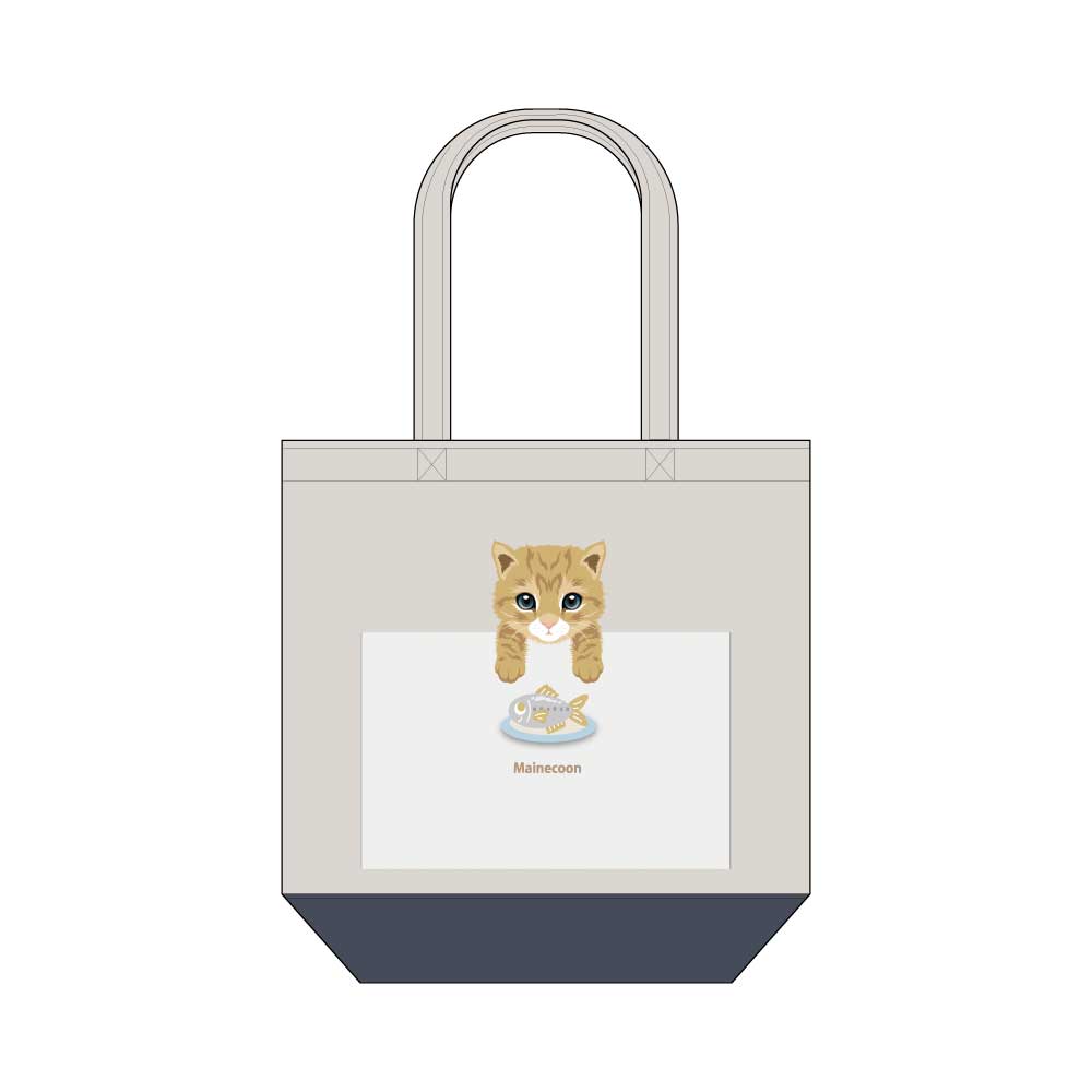 - かわいいメインクーンのイラストがプリントされたトートバッグです。ナチュラルとネイビーのバイカラーもおしゃれです。