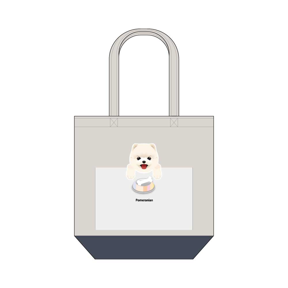 - かわいいポメラニアンのイラストがプリントされたトートバッグです。ナチュラルとネイビーのバイカラーもおしゃれです。