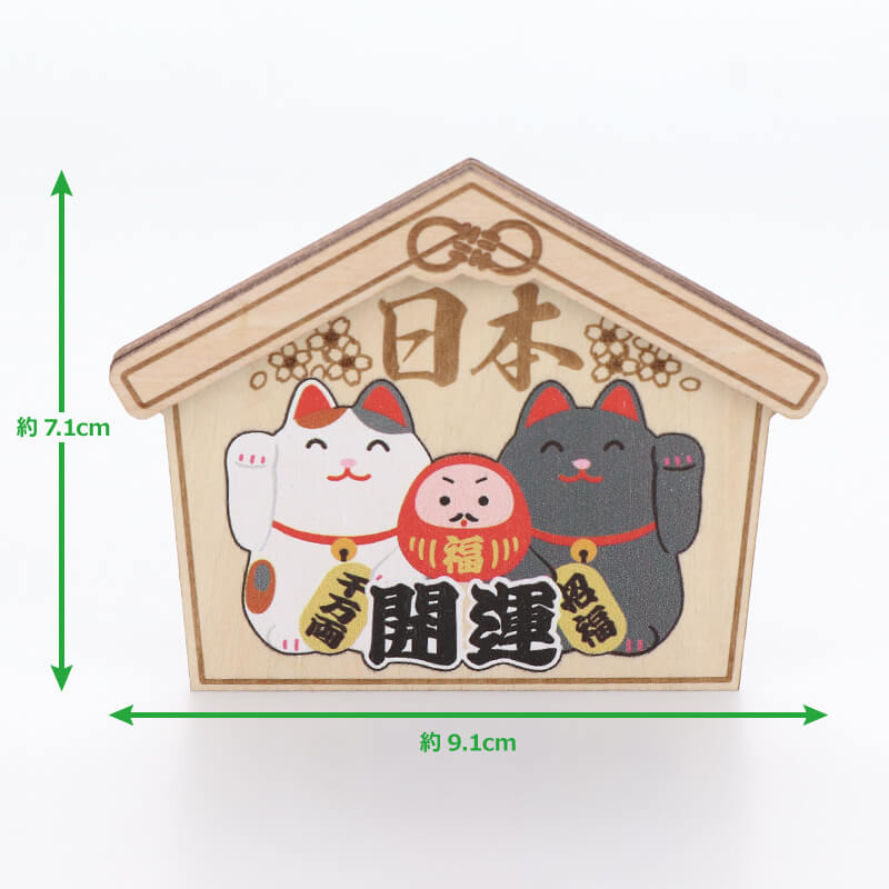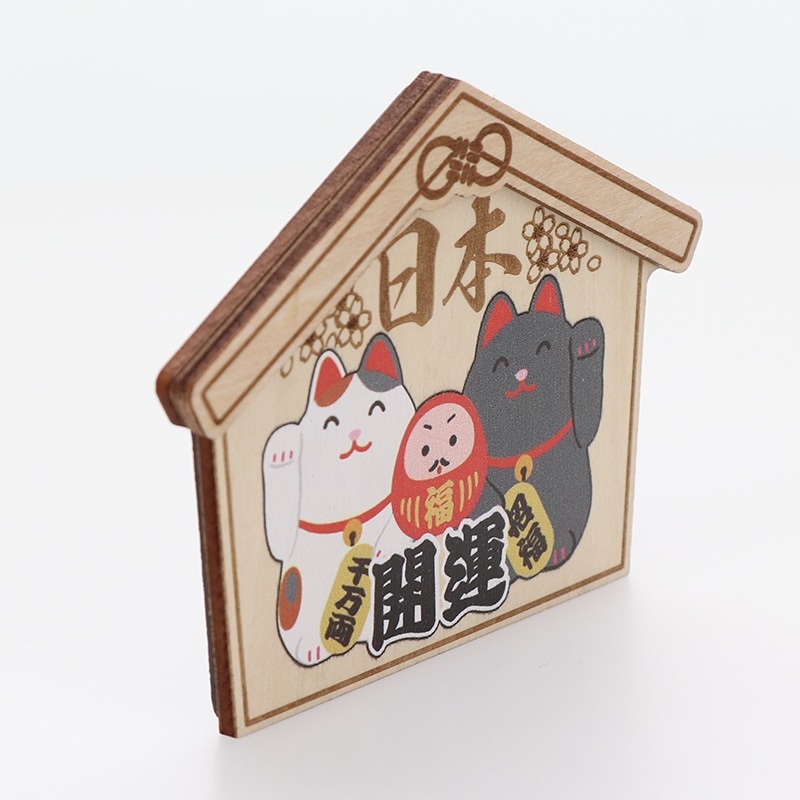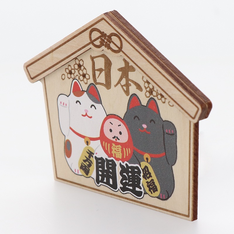 - 桜と日本の文字の焼印に、招き猫とだるまが描かれた、縁起の良い木製開運絵馬マグネットです。